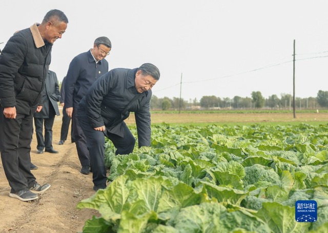 11月10日,中共中央總書記、國家主席、中央軍委主席習(xí)近平在北京、河北考察災(zāi)后恢復(fù)重建工作。這是10日下午,習(xí)近平在河北保定涿州市刁窩鎮(zhèn)萬全莊村村邊農(nóng)田察看大白菜長勢(shì)。新華社發(fā)(盛佳鵬攝)