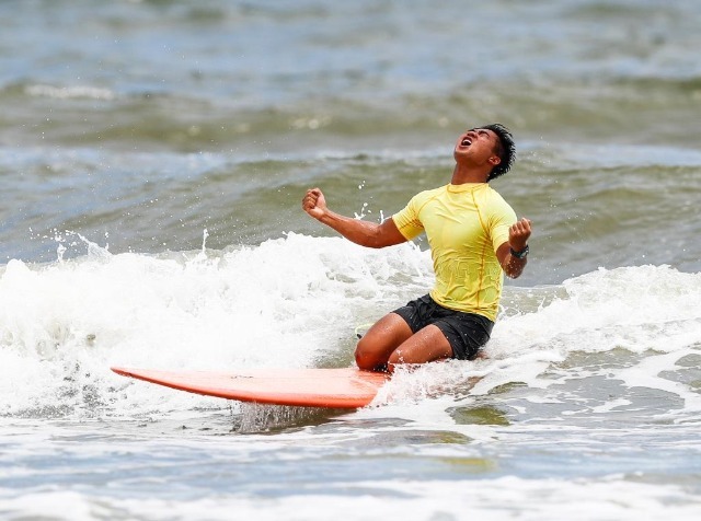7月11日,海口隊選手黃耀書在比賽后慶祝。他以14.7分的成績獲得冠軍。當日,第一屆全國學生(青年)運動會沖浪項目男子長板決賽在廣西北海市舉行。新華社記者 胡星宇 攝
