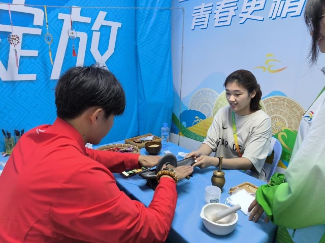 運動員村的非遺文化體驗區是不少運動員的“打卡點”,非遺項目傳承人和志愿者現場教學,運動員在比賽、訓練間隙,前來參與剪紙、邕劇臉譜繪畫、“點米成畫”、布藝繡球等手工項目。在這里,“青春風”與“中國味”用運動激情的方式達成雙向奔赴。