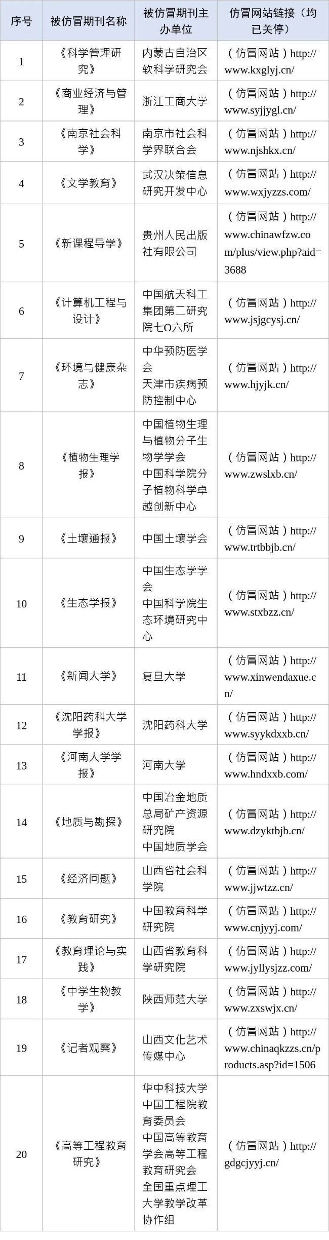 近日,中央網(wǎng)信辦舉報(bào)中心根據(jù)網(wǎng)民舉報(bào)線索,會(huì)同相關(guān)部門依法受理處置一批仿冒學(xué)術(shù)期刊詐騙網(wǎng)站。這些仿冒網(wǎng)站頁面與國內(nèi)一些高等院校、科研院所等主管主辦的學(xué)術(shù)期刊網(wǎng)站頁面內(nèi)容相似性很高,并冒用其名義對(duì)外發(fā)布約稿通知,誘騙作者投稿,借機(jī)收取所謂“審稿費(fèi)”“版面費(fèi)”斂財(cái)牟利,嚴(yán)重侵害網(wǎng)民合法權(quán)益,擾亂正常學(xué)術(shù)論文出版秩序。現(xiàn)公布一批仿冒詐騙網(wǎng)站名單,請(qǐng)廣大網(wǎng)民提高警惕,注意辨別,避免上當(dāng)受騙。