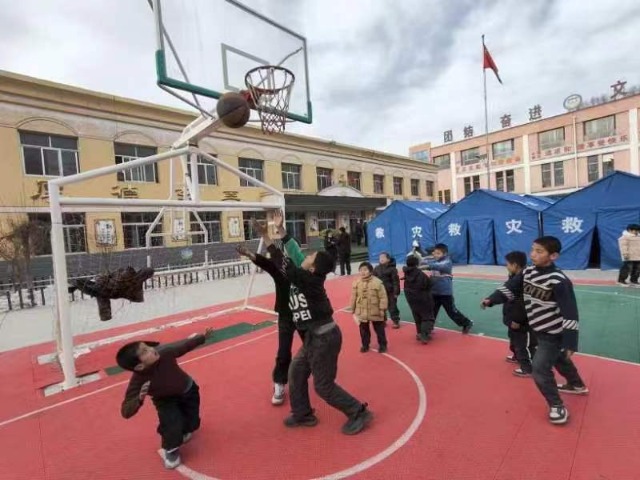 高李保安族春蕾小學(xué)安置點(diǎn)的操場(chǎng)上,幾個(gè)男學(xué)生在打籃球,幾個(gè)女學(xué)生跳著繩。
