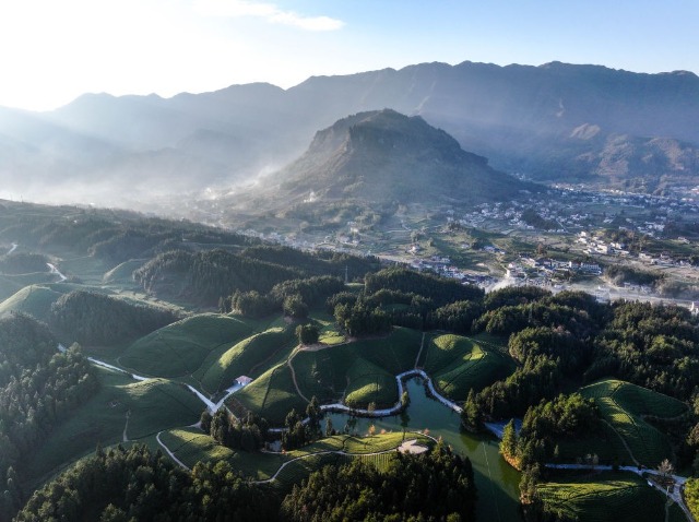 這是2023年12月5日拍攝的湖北省鶴峰縣走馬鎮楊柳池茶園風光(無人機照片)。新華社記者 楊文斌 攝