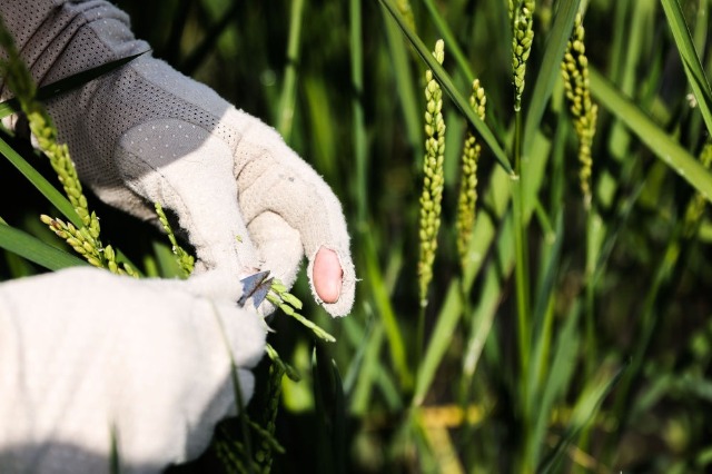 2023年2月22日,青島海水稻研究發展中心的科研人員于萌在三亞的國家南繁科研育種基地里做水稻雜交實驗。新華社記者 張麗蕓 攝