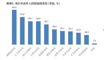 了解吸引未成年人的短視頻類型發現,未成年人最喜歡的短視頻類型(見圖表5)是幽默搞笑類(66.6%),其次是人文知識類(52.8%),這也與未成年人使用短視頻的主要目的是減壓放松和豐富知識相契合。與“2019年調查”相比,幽默搞笑類短視頻始終是未成年人最喜歡的短視頻類型,而人文知識類(“2019年調查”中排第三位)和熱點話題類(“2019年調查”中排第六位)在排序上有了較大提升,可見現在未成年人在使用短視頻時更傾向于獲取信息和學習知識。