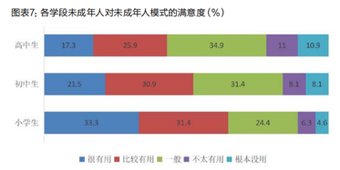 設置過“未成年人模式”的未成年人對其滿意度尚可,33.8%的未成年人表示很滿意,38.0%表示比較滿意。與城市未成年人相比,農村未成年人滿意度更高;學段比較發現,高中生滿意度最低(表示很滿意和比較滿意的比例合計30.9%),小學生滿意度最高(合計52.4%);學習負擔輕的學生對“未成年人模式”滿意度更高,表示很滿意、比較滿意的比例達91.9%,而學習負擔很重的未成年人此項比例為65.0%;親子關系很好的未成年人滿意度最高,占比76.5%,其次是關系較好的未成年人,表示滿意的占比68.5%,而親子關系一般的未成年人滿意度最低,表示滿意的占比55.2%,親子關系不太好、很不好的未成年人表示滿意的比例分別為61.3%、63.1%,這可能是未成年人服從家長要求的結果。另外需要關注的是,有8.1%的初中生和10.9%的高中生認為“未成年人模式”根本沒用(見圖表7)。