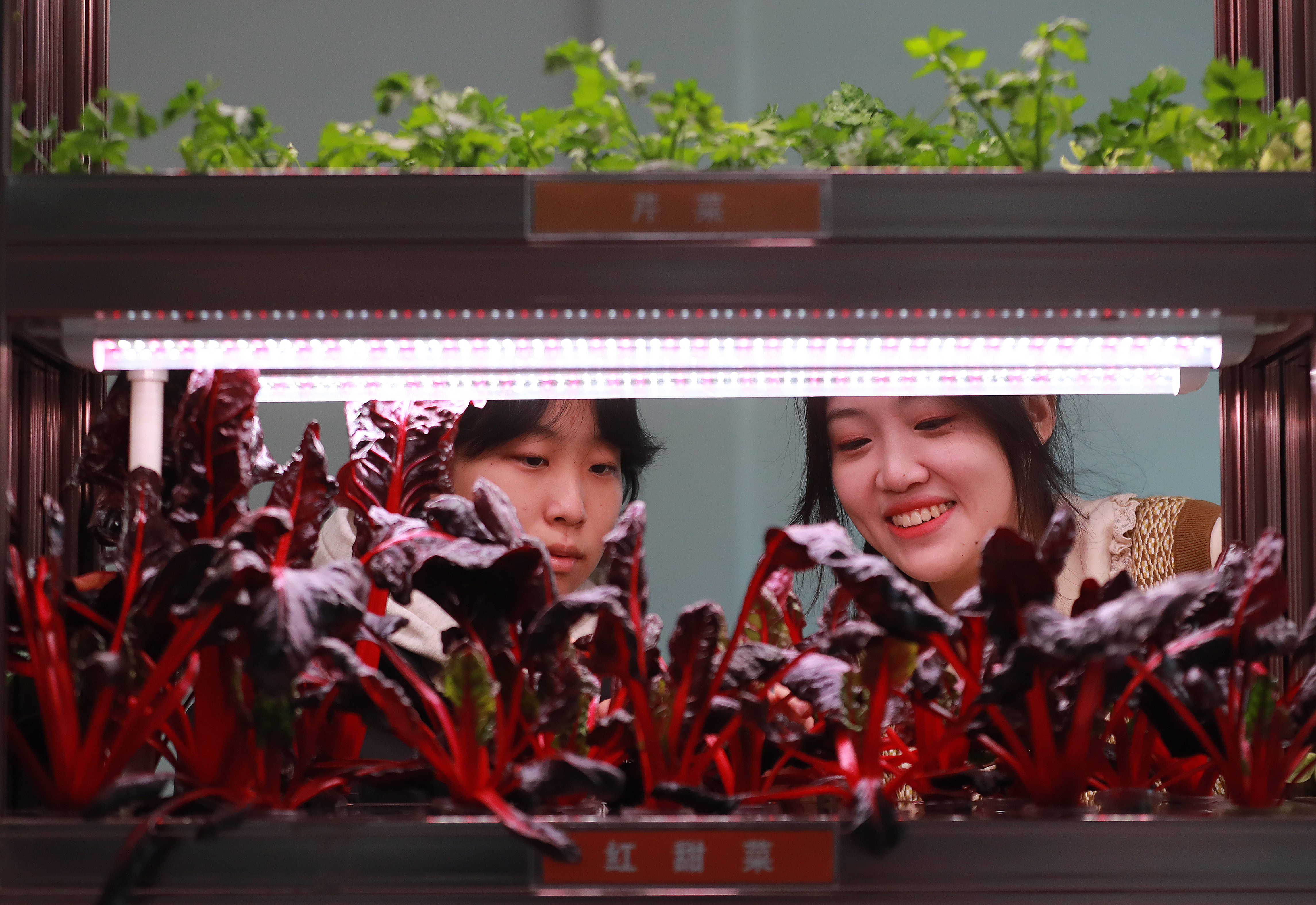 1月5日,沈陽農(nóng)大學(xué)生創(chuàng)新創(chuàng)業(yè)教育基地,“一品鮮蔬”項目組成員宣萱(左)、周滋航研討紅葉甜菜水培的管理與日常觀測。