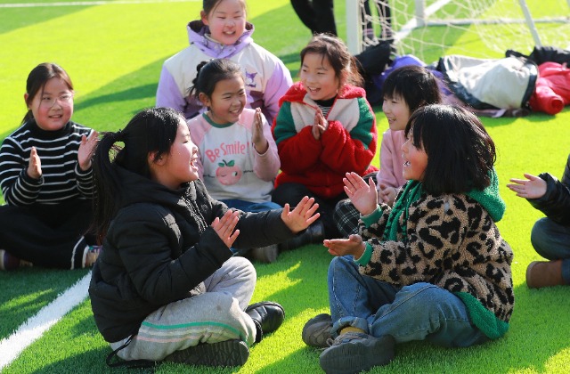 “龍年有進步!龍年更優秀!龍年要加油!”在孩子們的迎新口號聲中,一場足球賽結束,他們三個一群、五個一組,或是在草坪上嬉戲笑鬧,或是在跑道上跑步跳繩,操場上充滿了歡聲笑語。