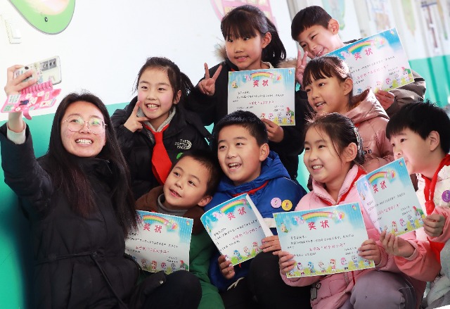 “來來來,看鏡頭,一、二、三……茄子!”一群小腦袋和老師擠在一起,快門按下,笑容定格,照片記錄了河北省淶水縣三坡學區馬各莊小學三年級孩子們期末“發獎”的快樂時光。