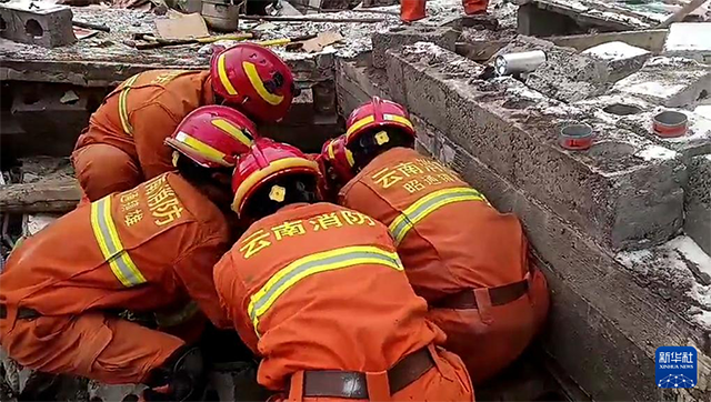 1月22日在云南省昭通市鎮雄縣塘房鎮涼水村拍攝的救援現場(視頻截圖)。新華社發