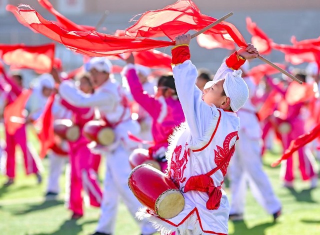 2023年11月16日,內(nèi)蒙古鄂爾多斯市鄂托克前旗第二小學(xué)的學(xué)生在大課間表演安塞腰鼓。該校將安塞腰鼓列入學(xué)校的校本課程和大課間活動,聘請民間藝人傳授技藝,讓非遺文化在校園中傳承。新華社發(fā)(王正攝)