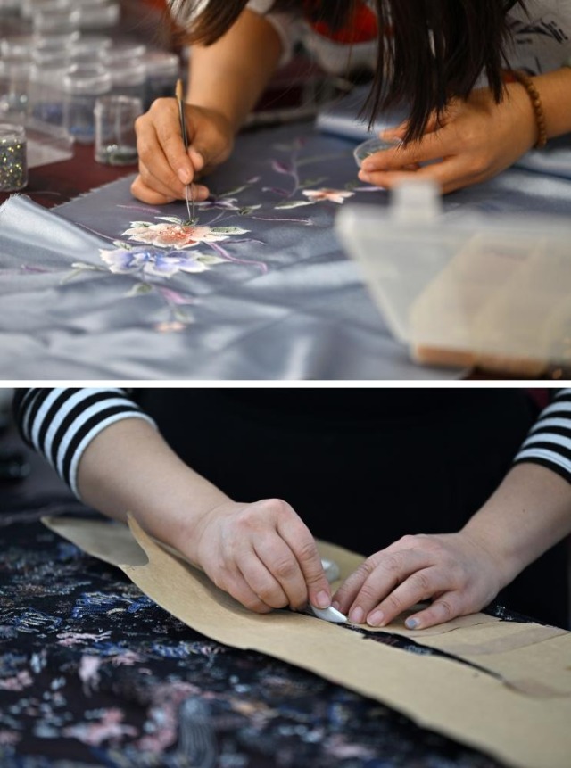 拼版照片:上圖為老美華定制車間的制衣師傅在面料上貼鉆;下圖為老美華定制車間的制衣師傅在面料上劃線(2023年12月8日攝)。天津老美華始創(chuàng)于1911年,歷史上以“千層底”布鞋聞名,是享譽(yù)津門的“中華老字號”。新華社記者 李然 攝