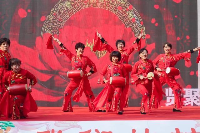 2023年12月28日,浙江省諸暨市趙家鎮村民在村晚舞臺上表演腰鼓。新華社記者 徐昱 攝