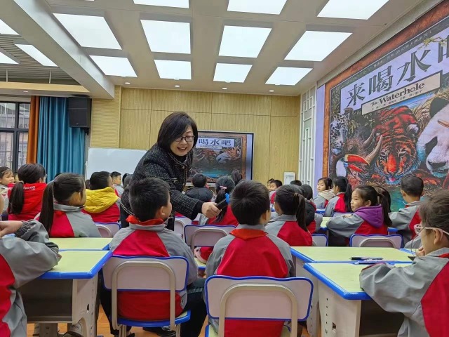走進張艷霞的辦公室,桌面上堆滿了很多書籍。澳大利亞作家葛瑞米·貝斯的作品《來喝水吧》總會放在最明顯的位置。這本書,張艷霞已數不清執教了多少次。看似簡單的圖畫書,里面涵蓋了語文閱讀、數學分析、生物研究、藝術鑒賞……幾乎所有的學科教師,都可以從這本書中找到教學切入點。“跟著書上青蛙‘探’游世界”,我們開展了動物情景劇、繪畫展、童謠歌會等多樣的活動,學生們還制作了屬于自己的探秘手冊。”帶著孩子們慢慢品讀,探尋世界的奧秘,張艷霞發現這更是閱讀的價值。
