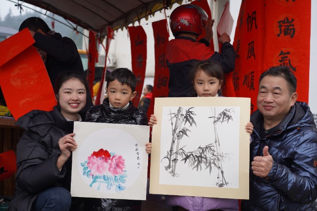 現(xiàn)場采購年貨趕集的村民紛紛駐足欣賞師生的春聯(lián)、國畫作品,精心挑選自己喜歡的墨寶,300余幅師生的春聯(lián)和國畫作品不到2小時就被大家一搶而空。