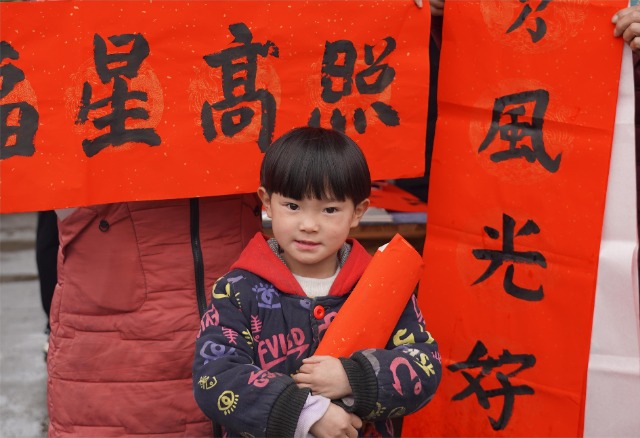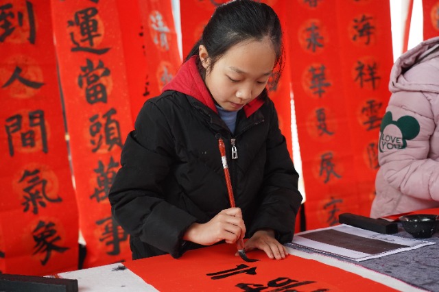 屋外雨腳細密,活動現(xiàn)場紅紙翻飛,一派熱鬧景象:30余名師生將一張張象征喜氣吉祥的紅紙鋪展開來,凝神聚氣、揮毫潑墨,為村民們送上濃濃的春節(jié)祝福。