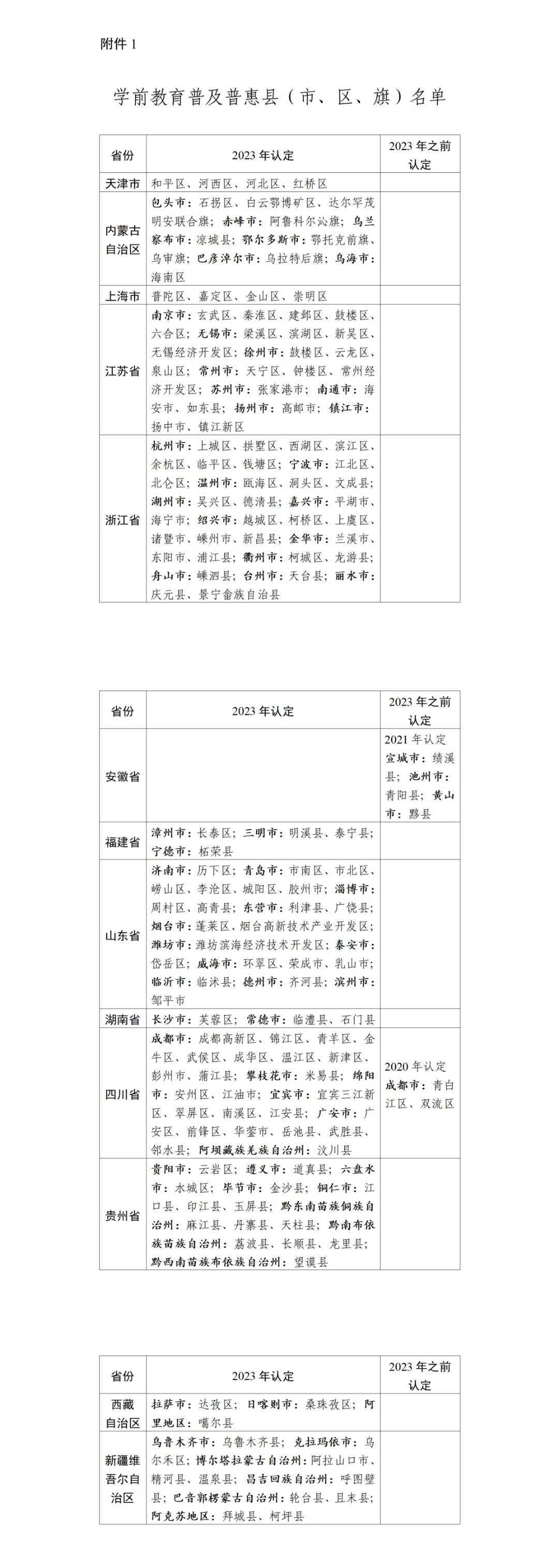 通過縣級自評、市級初核、省級評估、國家認定的督導評估程序,教育部辦公廳日前印發通知,2023年認定148個縣(市、區、旗)為學前教育普及普惠縣。具體名單見下: