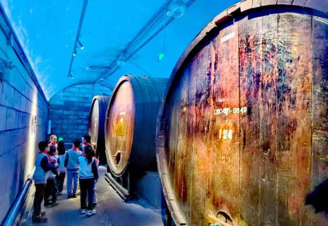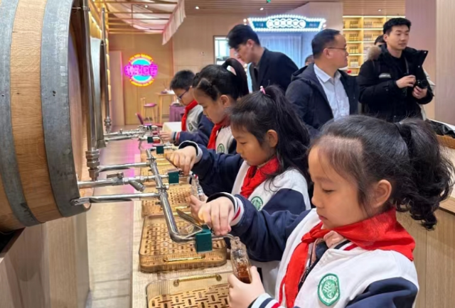 行進間,學生們深度參與學校與基地一對一開發的省級優秀研學旅行課程《探秘大馬路56號》。在學校小講解員的帶領下,大家參觀各個展廳、探秘百年地下大酒窖,一同體驗百年張裕企業文化及創辦人創業心路歷程,切身感受百年張裕的家國情懷;在二樓實踐體驗廳,學生體驗了“用印章組合張裕公司老門頭”“自制灌裝白蘭地酒”,在實踐中感受釀酒工藝中追求卓越的工匠精神。