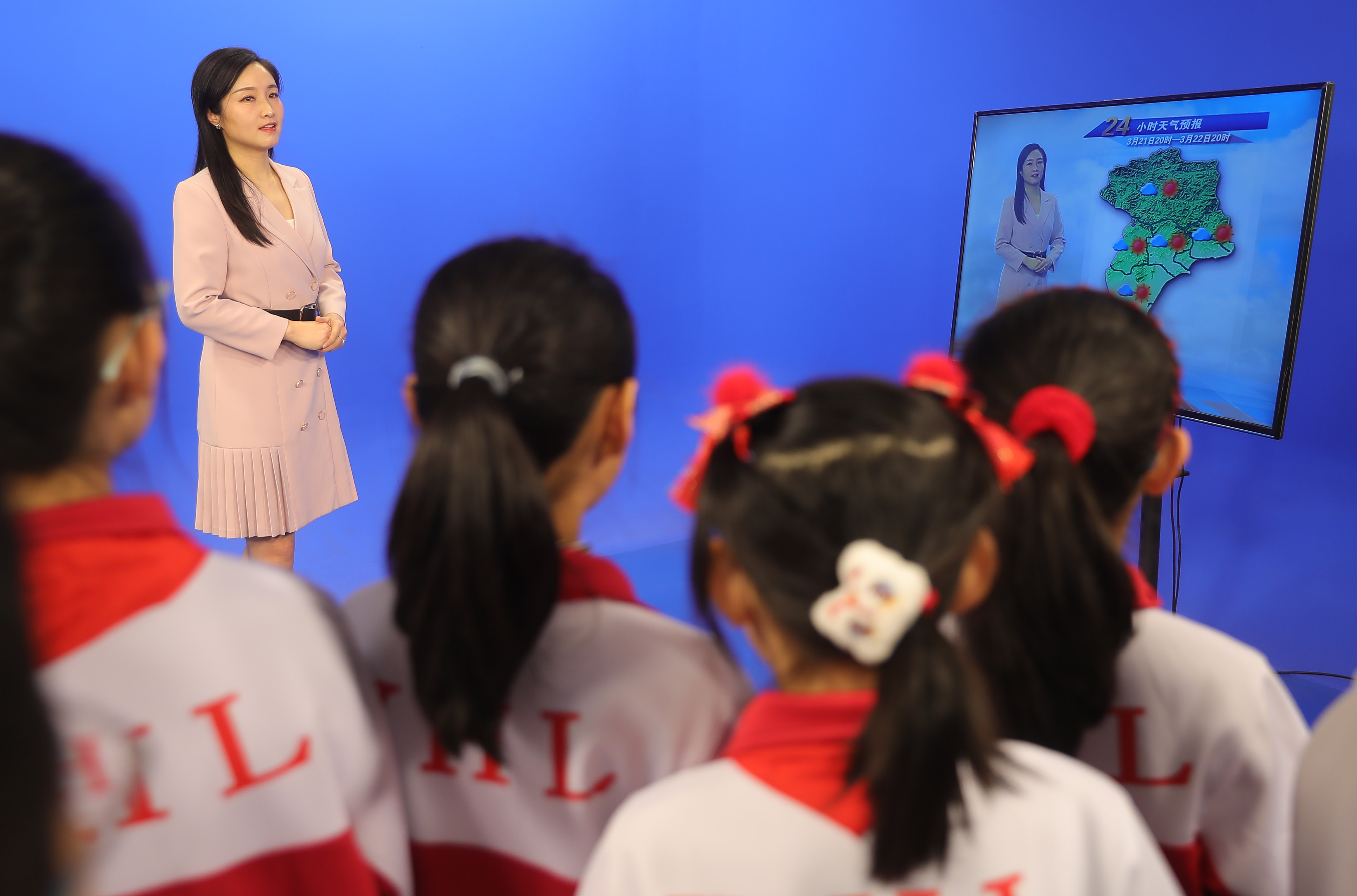 工作人員為海港區文化里小學學生講解氣象播報相關知識。 通訊員 曹建雄 攝