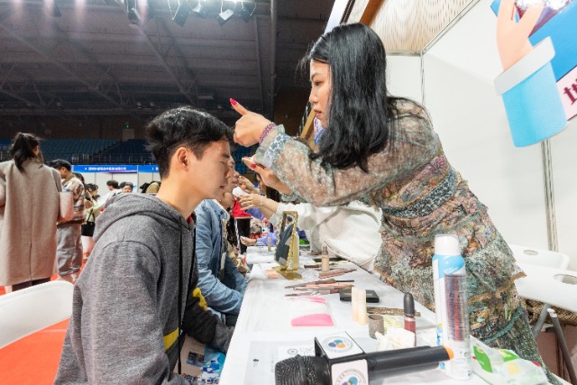 中國地質(zhì)大學(武漢)輔導員張恪為現(xiàn)場求職畢業(yè)生化職業(yè)妝。學校供圖