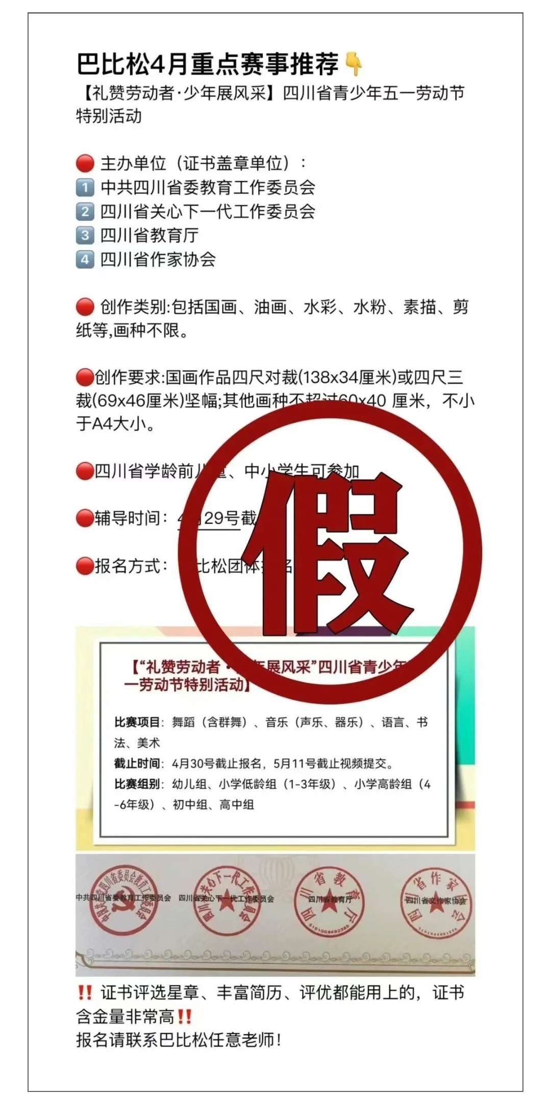 近日,四川省教育廳接群眾舉報,四川巴比松教育咨詢有限公司冒用“中共四川省委教育工作委員會、四川省教育廳”名義違規(guī)組織競賽,偽造公章,向家長進(jìn)行虛假宣傳,并收取報名費(fèi)、集訓(xùn)費(fèi)。