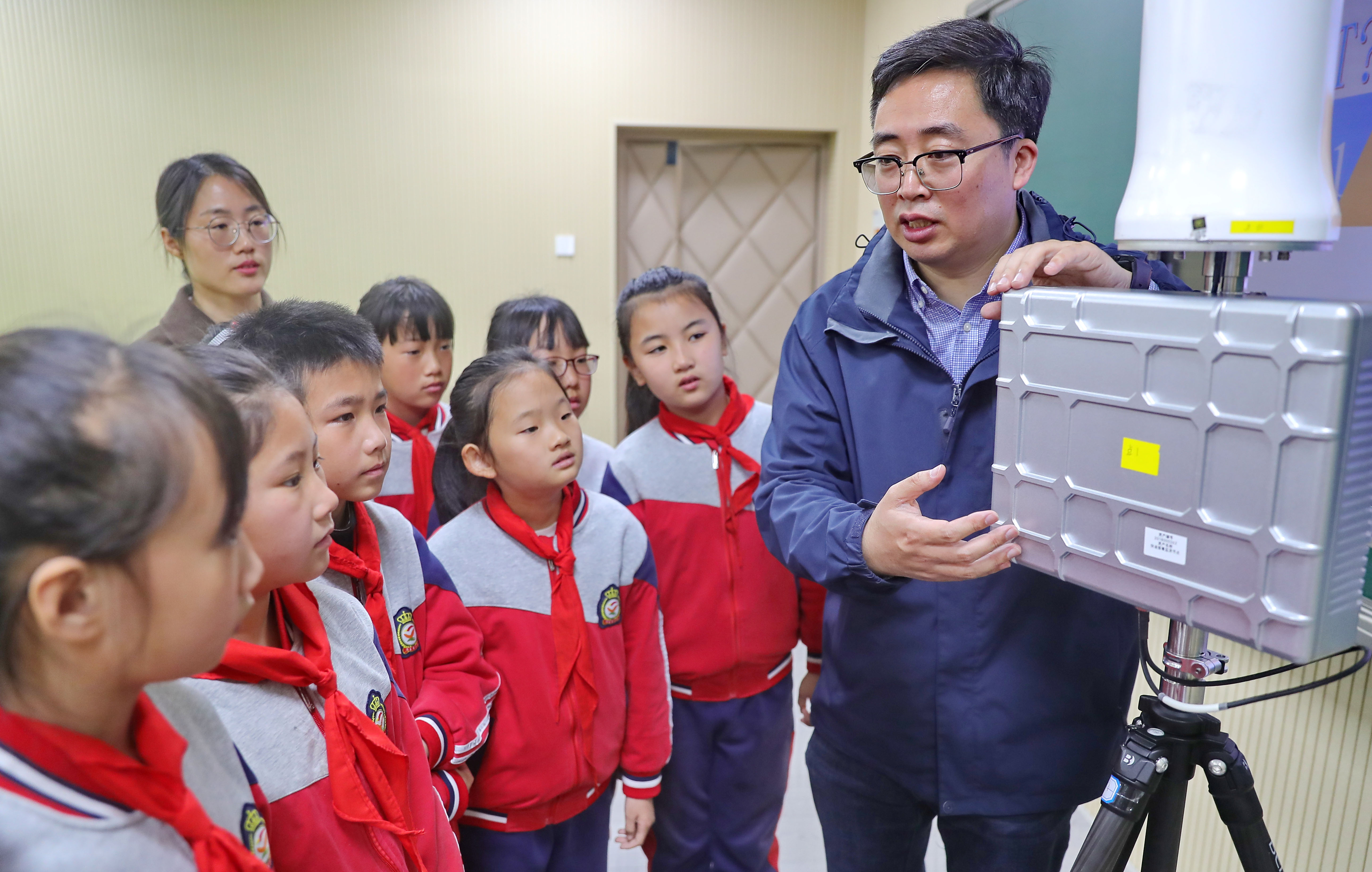 工作人員為海港區橋東里小學學生普及無線電知識,及無線電在國家安全相關方面發揮的重要作用。通訊員 曹建雄 攝