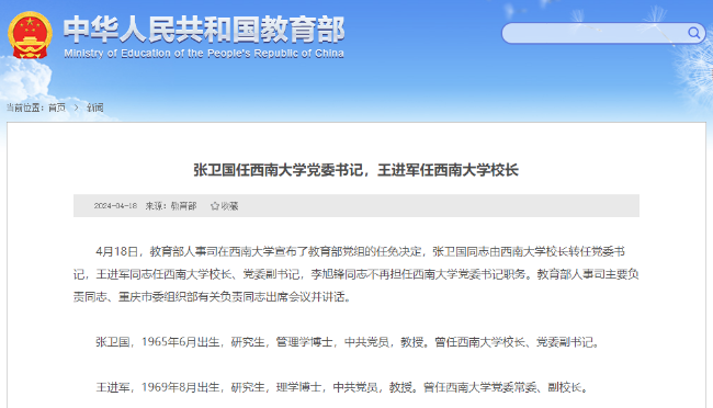 中國教育新聞網訊(記者 焦小新)4月18日,教育部人事司在西南大學宣布了教育部黨組的任免決定,張衛國同志由西南大學校長轉任黨委書記,王進軍同志任西南大學校長、黨委副書記,李旭鋒同志不再擔任西南大學黨委書記職務。教育部人事司主要負責同志、重慶市委組織部有關負責同志出席會議并講話。