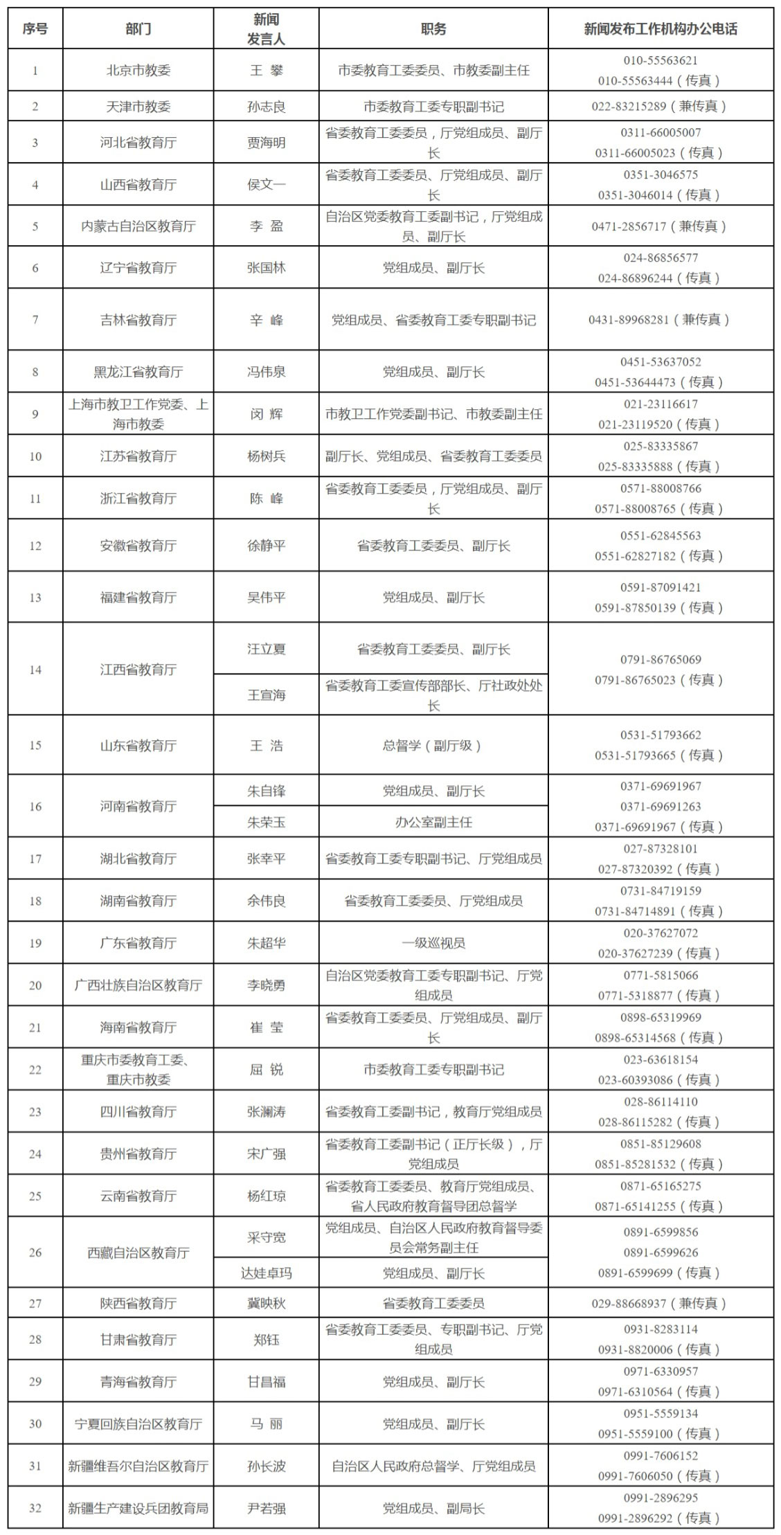 各省(區、市)教育部門新聞發言人名單和新聞發布工作機構電話