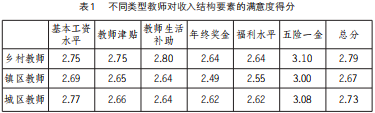 鄉村教師收入待遇逐年提高但有上升空間。鄉村教師收入待遇逐年提高,鄉村教師高于同層次鎮區教師,但低于城區教師。課題組調研數據表明:鄉村教師月收入在3000元以上的比例占66.97%,高于鎮區教師(含鎮中心區、鎮鄉接合區、特殊區域)的66.11%,但低于城區教師(含主城區、城鄉接合部)73.27%的比例。鄉村教師對自己收入結構要素的滿意度總分是2.79分,優于鎮區教師和城區教師的2.67分和2.73分。(見表1)