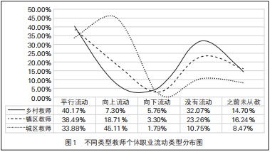 促進鄉村教師隊伍交流輪崗式流動刻不容緩。調研中發現,不少縣域內義務教育教師輪崗制度取得新突破,多年來困擾城鄉教師合理有序雙向流動的體制機制性障礙漸次破解,實質性激發了從教活力。但囿于現有崗位設置和職稱評聘等綜合因素影響,鄉村教師的流動性依然低于城區和鎮區教師。受調學校中有近三成鄉村教師沒有發生職業流動(占32.07%),高于鎮區教師和城區教師23.26%和10.75%的未流動率。在發生職業流動的教師群體中,鄉村教師以平行流動為主(占40.17%),高于鎮區教師(占38.49%)和城區教師(占33.88%)。可見,在做好城鎮學校教師到鄉村學校交流輪崗的基礎上,要進一步通過強制性和激勵性制度雙管齊下深化改革,以激發鄉村學校教師到鎮區和城區學校任教。(見圖1)