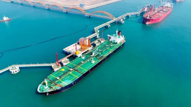 在山東港口日照港嵐山港區30萬噸級油品碼頭,船舶??窟M行卸油作業(無人機照片)。新華社記者 郭緒雷 攝