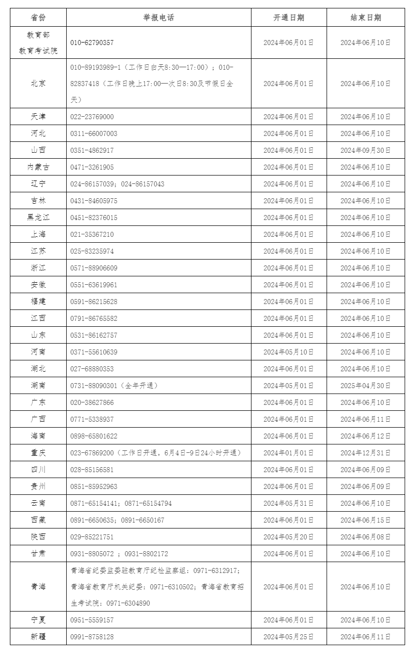 近日,教育部統一公布了教育部以及各省(區、市)2024年的高考舉報電話,歡迎廣大考生、家長及社會各界人士及時舉報反映涉及2024年高考的問題線索。教育部及各省(區、市)將會同有關部門根據舉報線索第一時間核查處理,堅決維護高考公平公正。