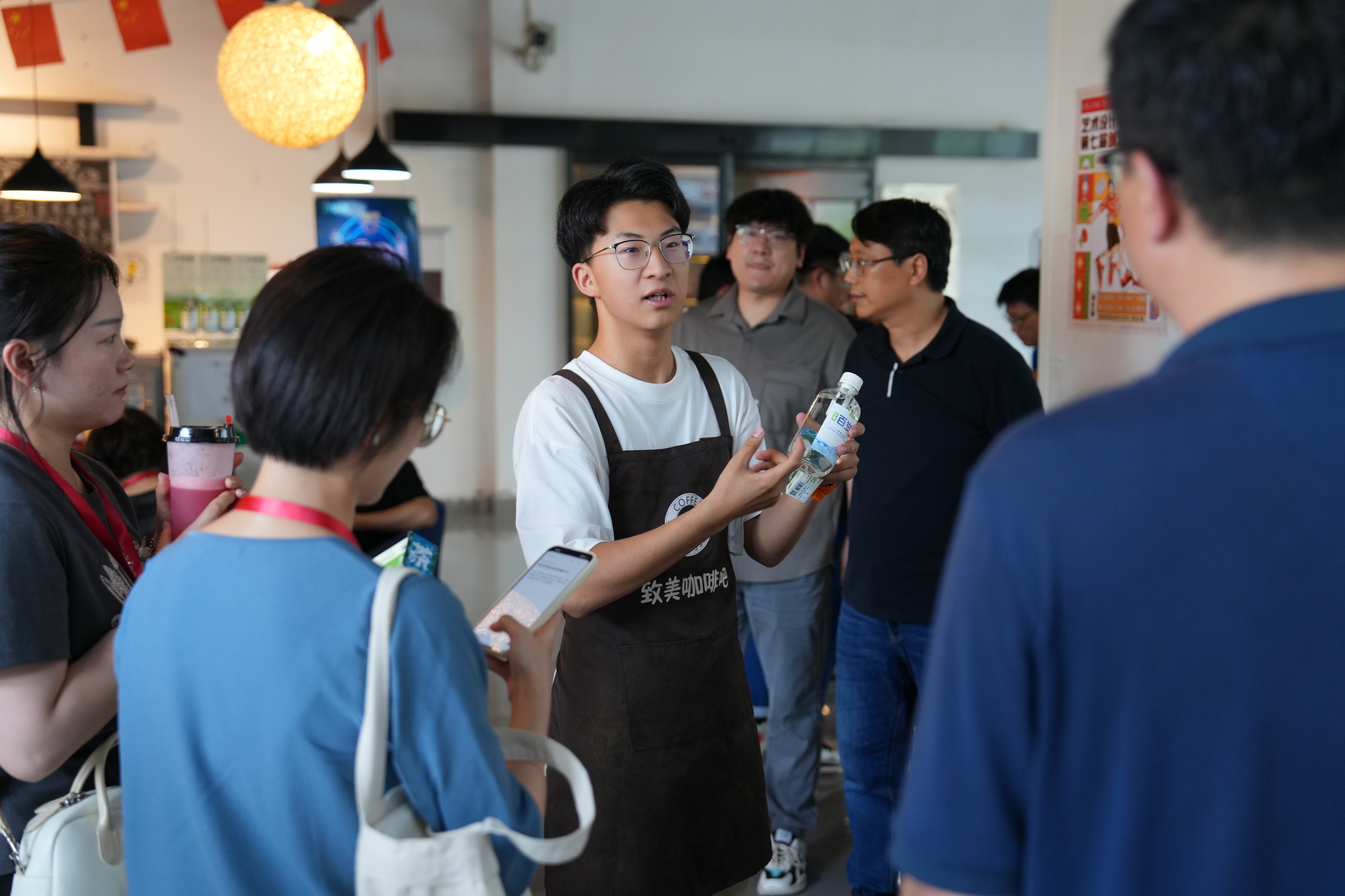 “這是我們4月份剛剛研發出的冷泡茶,用的是弱堿性強一點的山泉水,冷泡更好喝,上邊的茶葉還可拆卸,適配市面上大多數飲料的瓶口。”冷泡茶研發者、數字媒體藝術22級學生袁彬向采訪團介紹,目前該款冷泡茶已經投入校園,之后將投入校外市場。