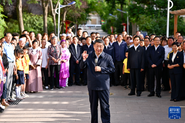 6月19日至20日,中共中央總書記、國家主席、中央軍委主席習近平在寧夏考察。這是19日下午,習近平在銀川市金鳳區長城花園社區考察時,同社區居民親切交流。新華社記者 燕雁 攝