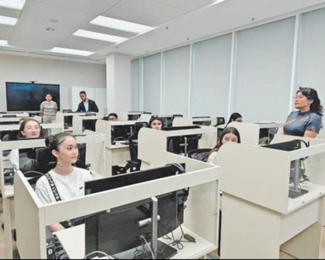 近日,阿斯塔納國際大學學生在北京語言大學哈薩克斯坦分校的教室里體驗通過國際中文智慧教學系統學習中文。邢曉婧 攝