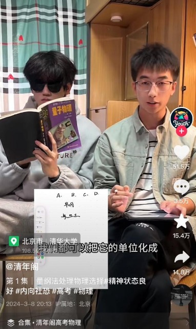 從今年3月發出第一個視頻至今,“清年閣”抖音賬號已發出超過100條視頻,粉絲數超120萬,閱覽量超1億次。視頻內容多為高考各學科的考點和知識分享。近期結合高考填報志愿,賬號也推出了多個大學專業的介紹視頻。