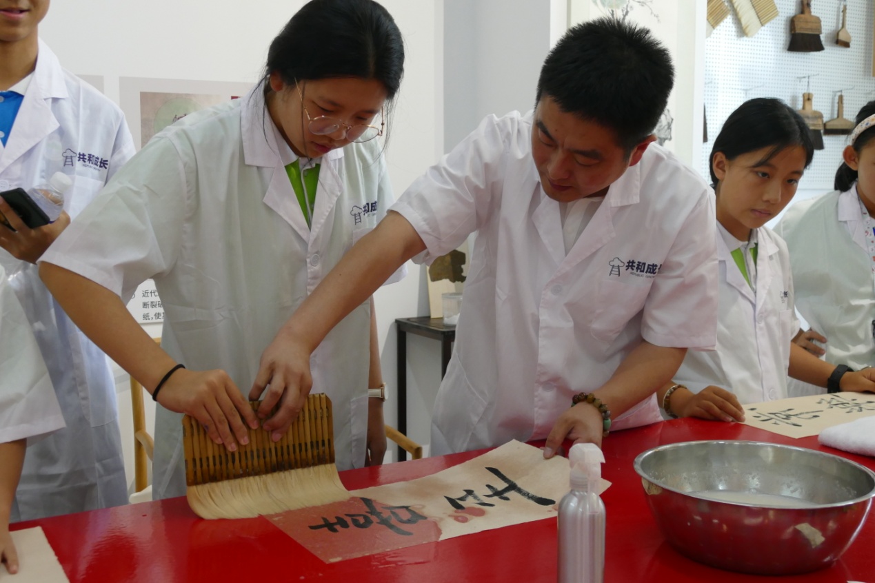 活動當天,記者看到在巨大的紅色桌案前,隋濤向中學生們展示了由于保存不當而發黃的書畫修復過程,孩子們舉起手機記錄下紙張由灰褐色變成純白色,并且不時提出自己的疑問,一場與“非遺”“化學”“歷史”“藝術”相關的綜合課程讓孩子們印象深刻。“沒想到高錳酸鉀和維C這樣看似簡單的物品就能夠讓書畫作品重獲新生,真的很神奇。”來自泰山學院附屬中學的董尚沁陽告訴記者。