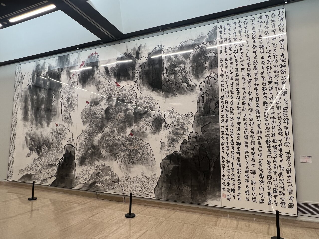 此次為期10天的展覽,展出了顧偉璽近些年來創作的中國畫山水和花鳥作品,大部分是顧偉璽赴太行山、黃山、云南等地進行寫生教學時的創作。其中不僅有《平型關大捷》《紅旗渠》這樣能夠反映出他對宏大歷史畫面營建的能力和才情的大尺幅作品,也有以現代人物和家鄉山水為表現內容,筆墨淋漓的“漁灣系列”。他的作品以書入畫,體現出中國畫寫意精神所傳達的東方詩意和藝術感染力。