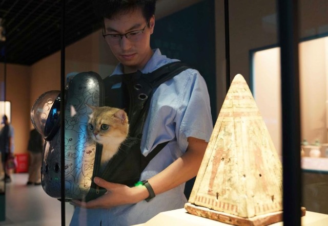 7月27日,寵物貓與主人在上海博物館“金字塔之巔:古埃及文明大展”“薩卡拉的秘密”展區內觀展。新華社發(陳浩明 攝)