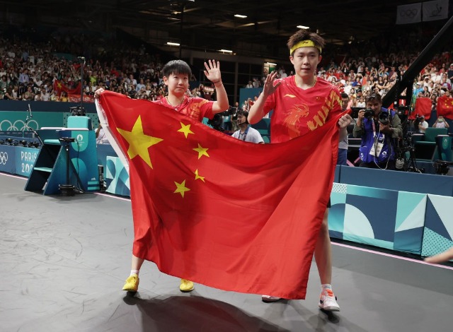 7月30日,王楚欽(右)/孫穎莎在巴黎奧運會乒乓球混雙決賽奪冠后慶祝。
