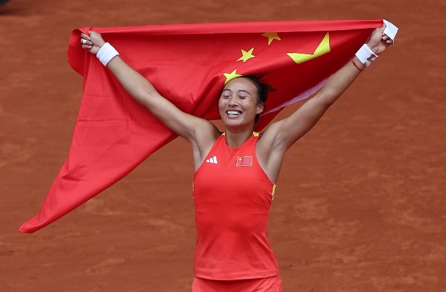 8月3日,中國選手鄭欽文在贏得網球女子單打金牌賽后身披國旗慶祝奪冠。