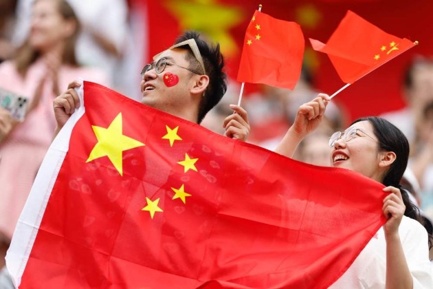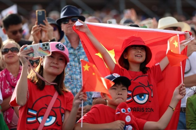 8月1日,一位小觀眾在頒獎儀式后揮舞中國國旗。在巴黎奧運會游泳項目女子4x200米自由泳接力決賽中,中國隊獲得季軍。