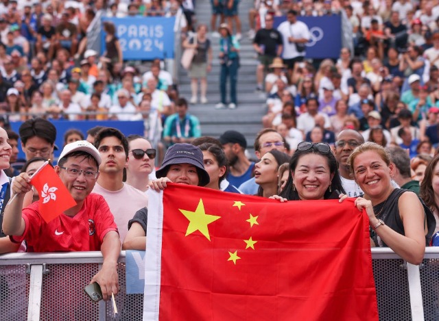 8月3日,觀眾在巴黎奧運會網球女單決賽現場加油助威。