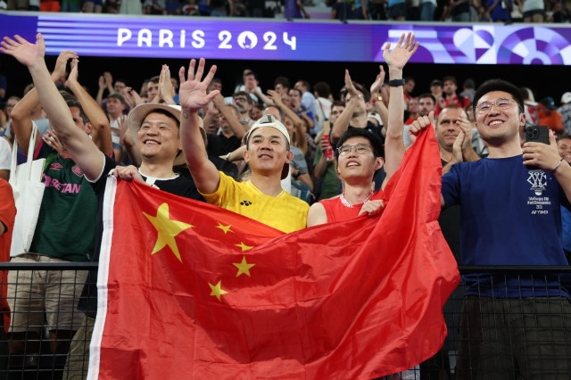 7月31日,觀眾在比賽羽毛球混合雙打四分之一決賽現場為中國選手加油。