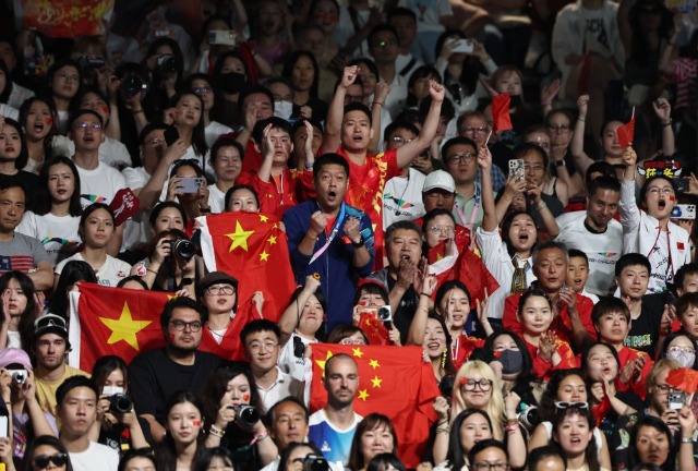 7月30日,觀眾在巴黎奧運會乒乓球混雙決賽現場加油助威。
