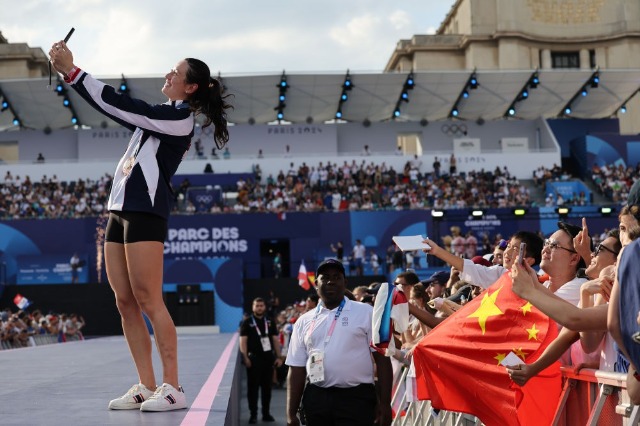 8月1日,女子100米自由泳、200米自由泳季軍得主中國香港選手何詩蓓在冠軍公園與觀眾合影。