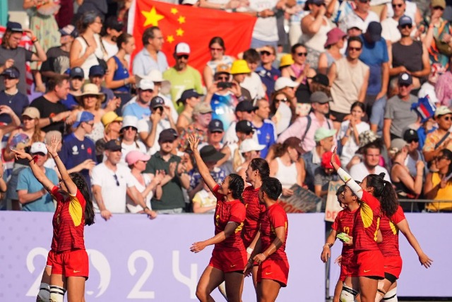 7月30日,中國隊選手在比賽后向觀眾致意。在巴黎奧運會七人制橄欖球女子五、六名排位賽中,中國隊7比21不敵法國隊,獲得第六名。