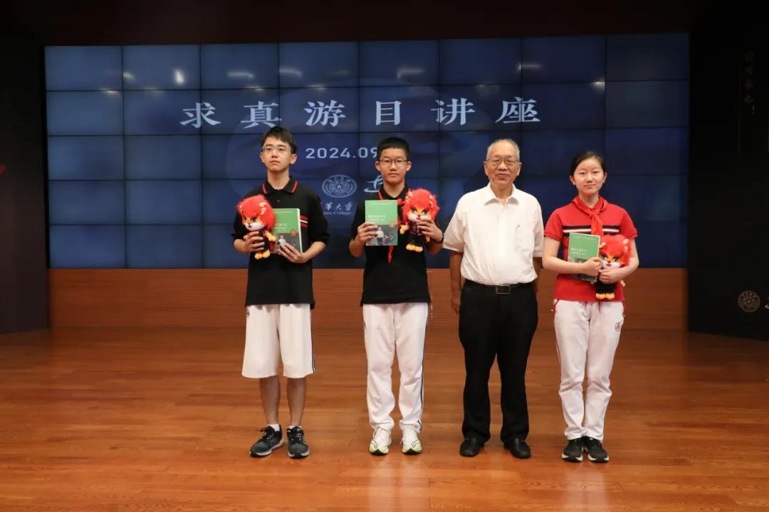 丘成桐先生向提問學生頒發紀念品并合影。學校供圖。
