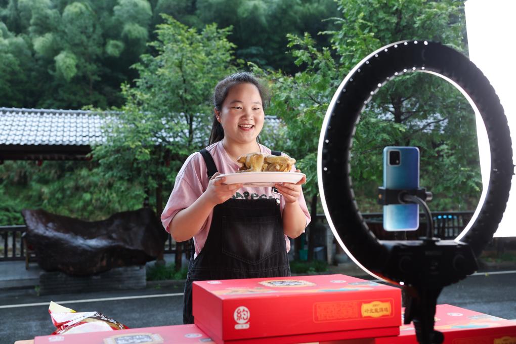 2024年9月19日,浙江省諸暨市嶺北鎮一位主播在直播銷售嶺北鹽焗雞。新華社記者徐昱攝