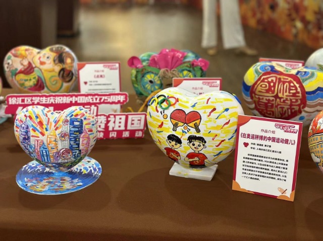 在老房子藝術中心的展臺上、窗格旁,擺放著75顆別出心裁的中國“心”。這些由徐匯區中小幼學生親手設計并制作的“心”,承載著孩子們對祖國的深情。有的“心”巧妙融入了書法、國畫的精細與靈動,有的“心”將科技與藝術巧妙結合,還有的“心”融入了上海的特色元素……孩子們用不同表達方式傳遞著對祖國的熱愛和自豪。