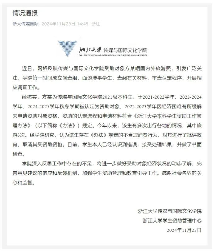11月23日,浙江大學傳媒與國際文化學院、浙江大學學生資助管理中心發布“情況通報”稱,學院成立調查組,面談涉事學生,查閱有關材料,審查認定程序,開展相應調查工作。